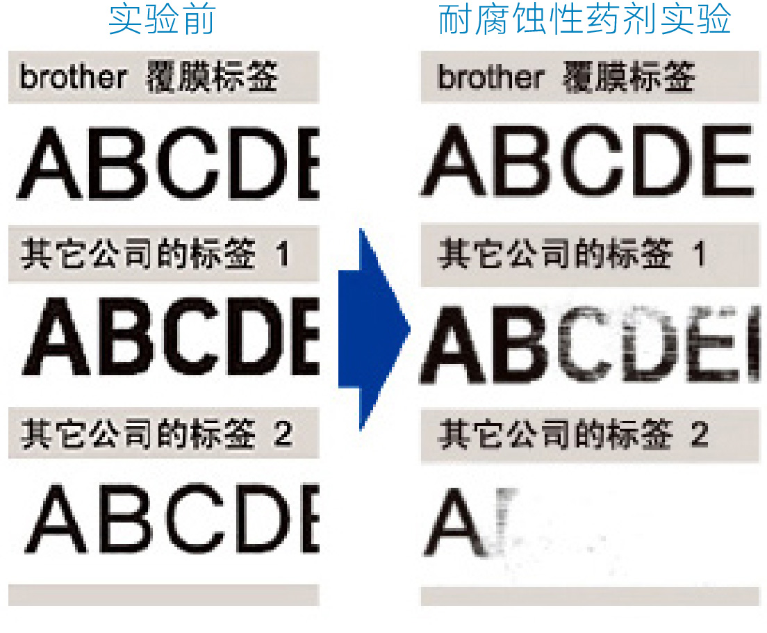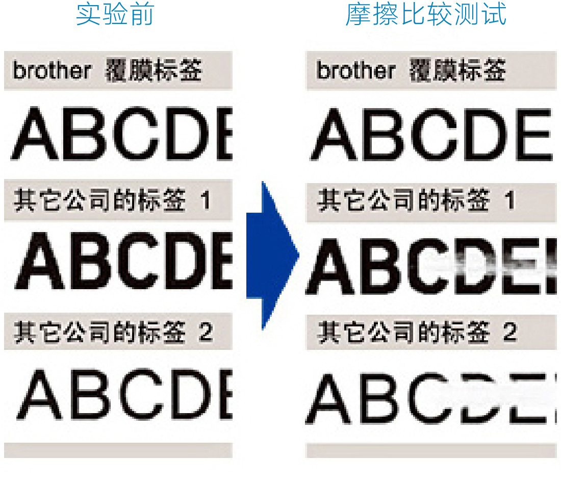 我們將Brother的覆膜標簽和其它公司標簽進行了各項經久耐用性對比實驗。從實驗結果得知。Brother的覆膜標簽因為表面有覆膜層保護印刷面。